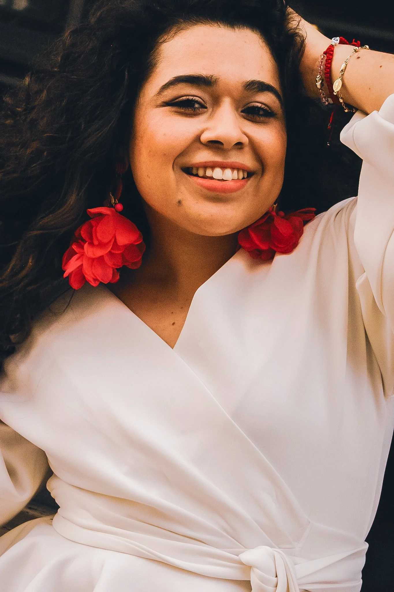 A woman with curly hair wearing large red flower earrings and a white top, smiling and posing with one hand behind her head during her glamour photoshoot. Photography by a photographer in Columbus Indiana