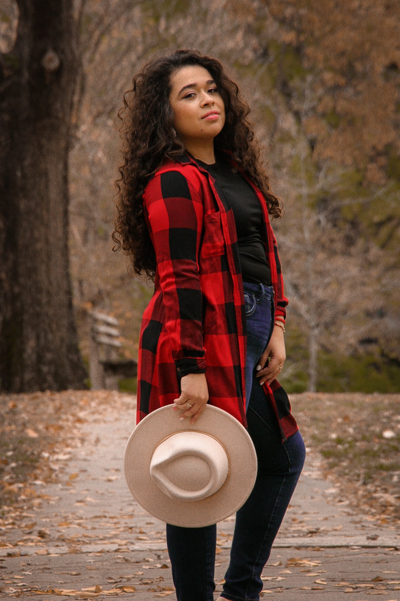 A woman with curly hair wearing a black shirt, red and black plaid shirt, and dark jeans, holding a wide-brimmed beige hat, standing outdoors on a leaf-covered path during her glamour photoshoot. Photography by a photographer in Columbus Indiana