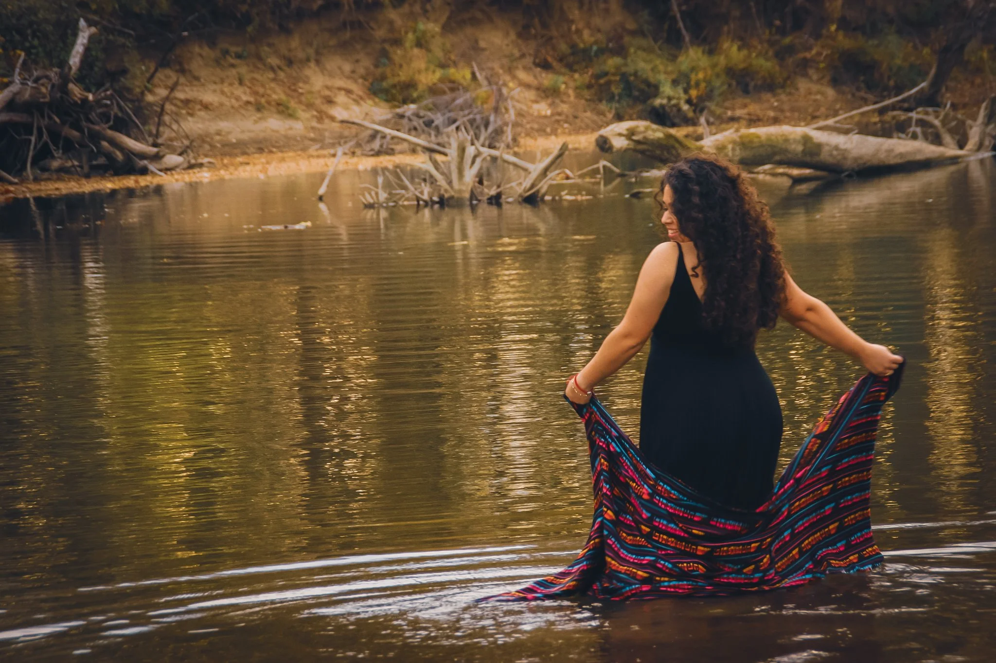 A woman with curly hair wearing a black dress stands in a river, holding a colorful patterned fabric, with trees and logs in the background during her glamour photoshoot. Photography by a photographer in Columbus Indiana