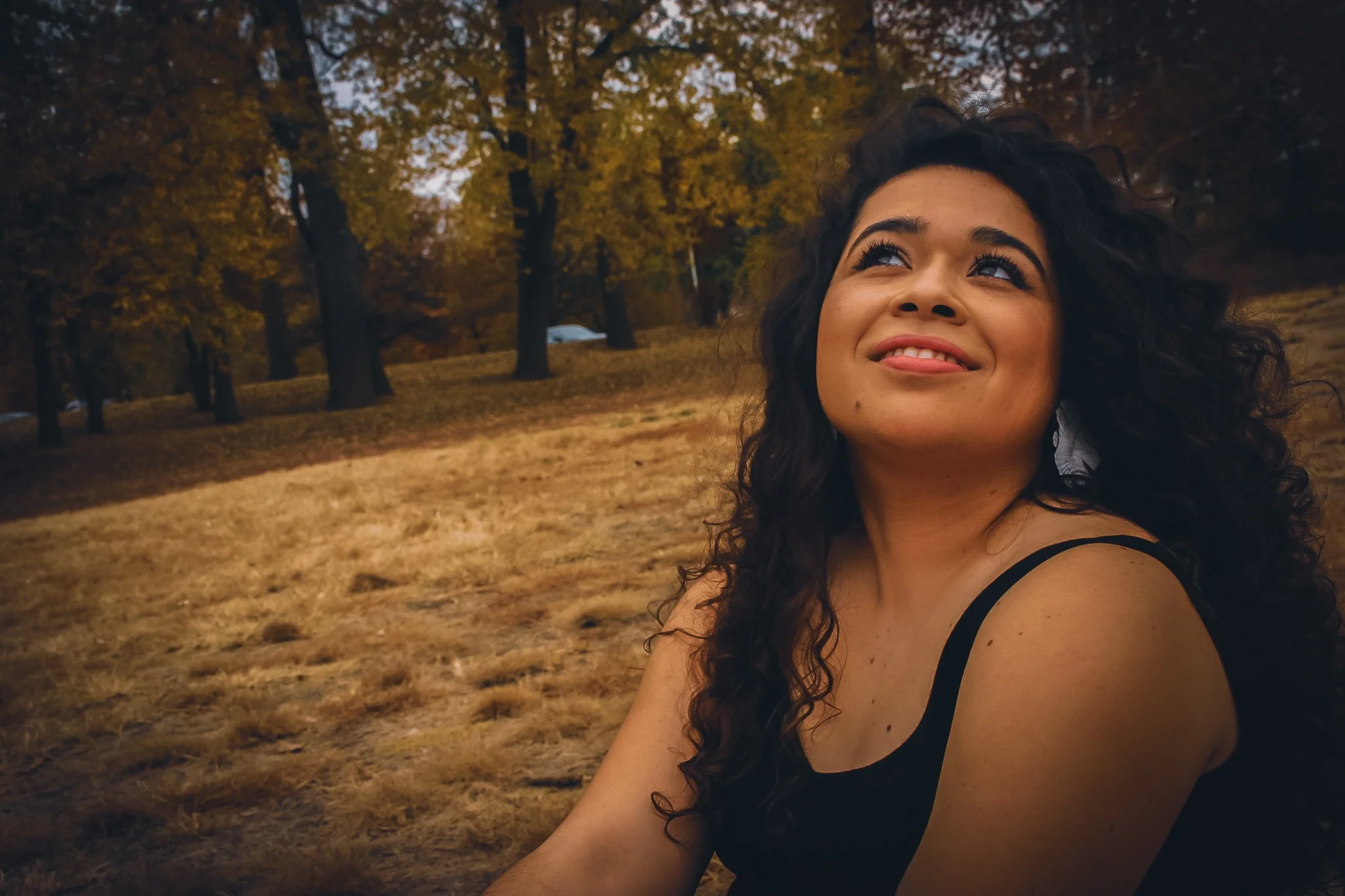 Photo of a woman with dark curly hair and a black tank top sitting outdoors in a wooded area with brown leaves and trees. Photography taken during her birthday glamour photoshoot by photographer in Columbus Indiana.